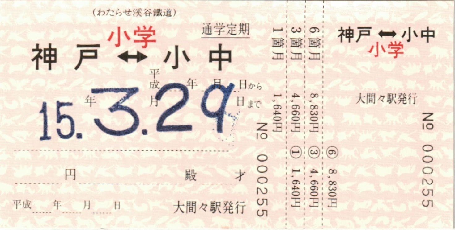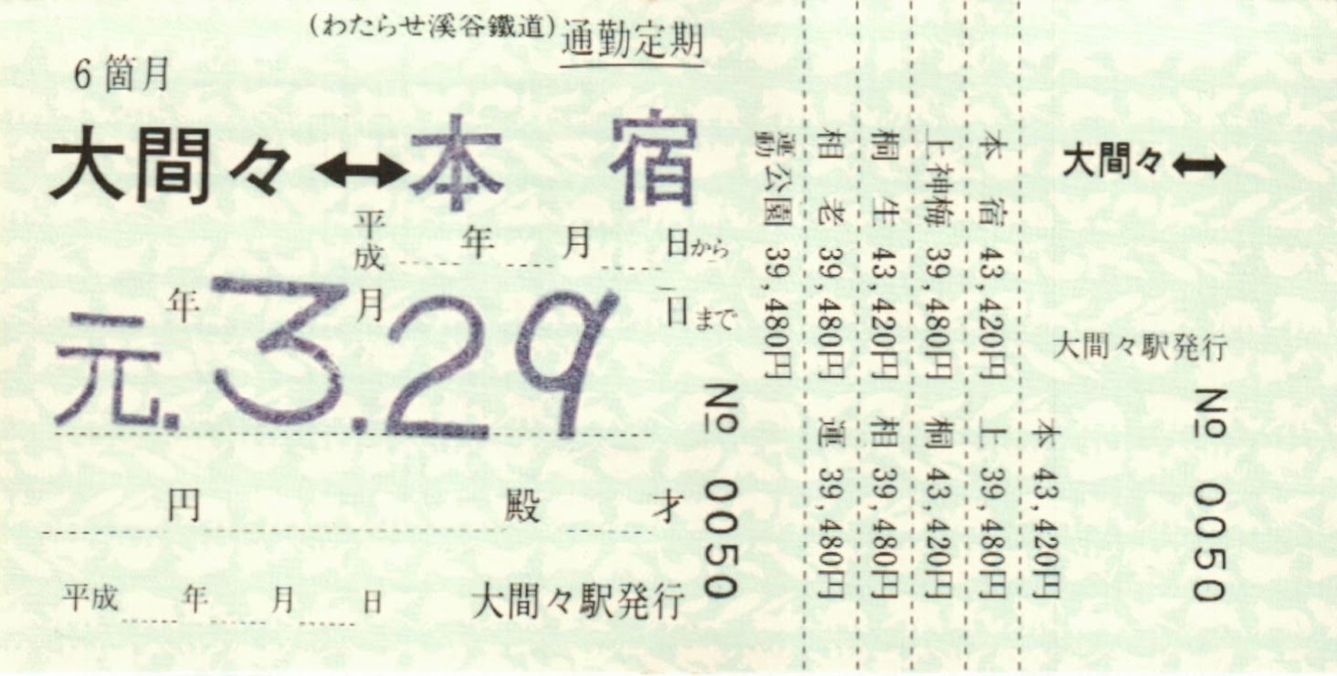 わたらせ渓谷鉄道~定期券 わたらせ渓谷鉄道 X Facebook はてブ LINE コピー 2017.03.14 わたらせ渓谷鉄道のブースでは、過去に発売した(現在も発売している??)切符を多数発売しています。 大人用、小人用定期券です。上は着駅補充式で右側が距離に応じて切り離す準片のような様式になっています。 下は着駅常備式ですが、有効期間に応じて右側を切り離すタイプです。