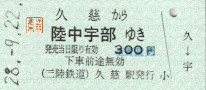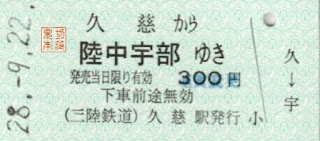 三陸鉄道~久慈駅硬券 三陸鉄道 X Facebook はてブ LINE コピー 2017.06.08 青い森鉄道で八戸に到着後、久慈線で久慈へ。 久慈からは三陸鉄道北リアス線に乗車しました。 久慈駅の硬券入場券です。 硬券乗車券です。乙片の表記が簡素なのが特徴です。 宮古ゆきの券は実使用しました。下車時に裏面に「済」印が捺されました。