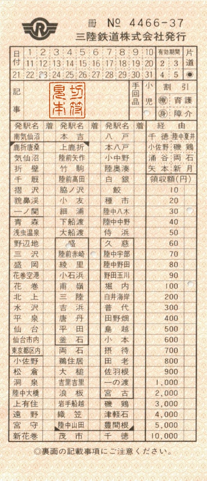 三陸鉄道~盛駅補充券