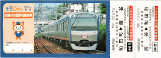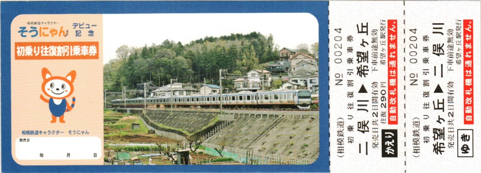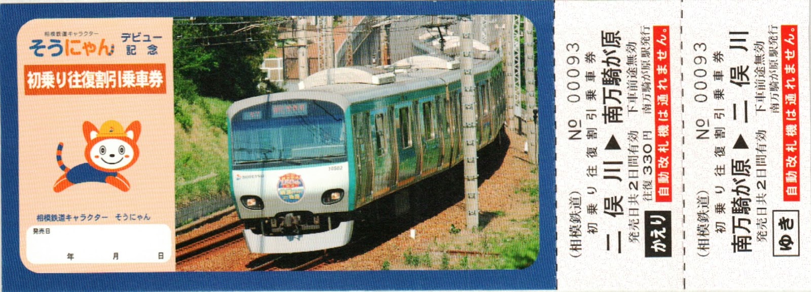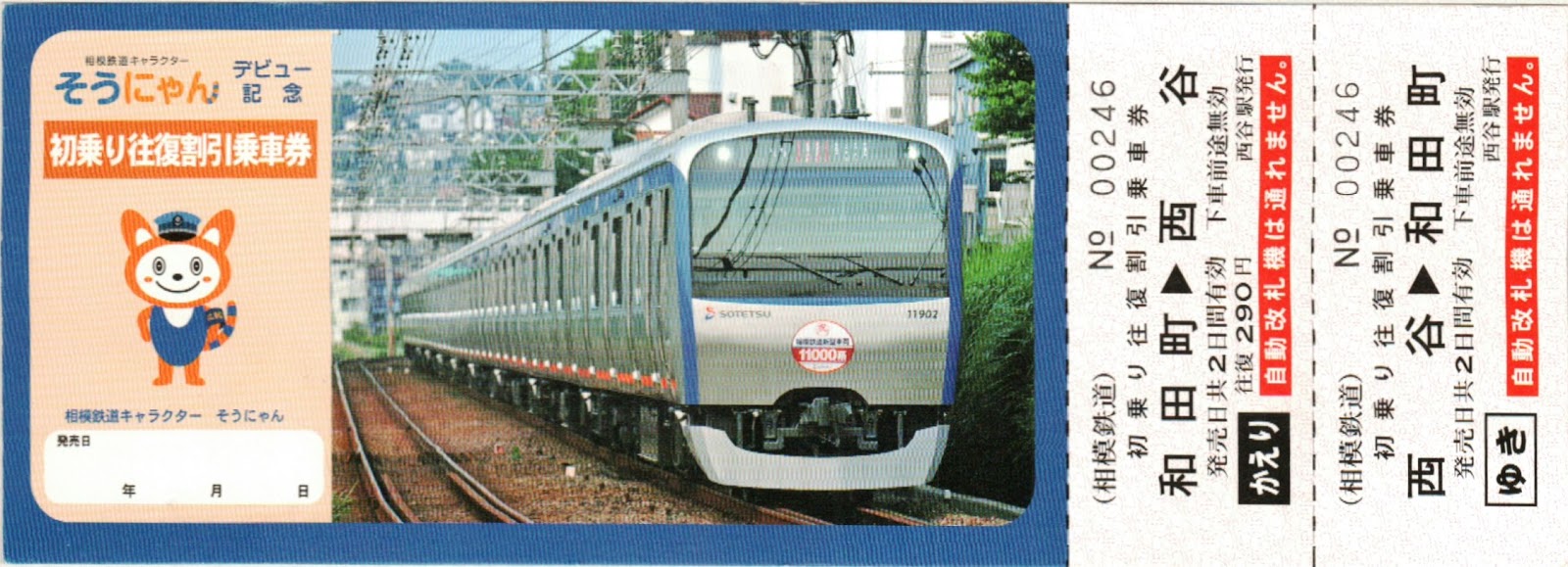 相模鉄道~そうにゃんデビュー記念初乗り往復割引乗車券(2) 相模鉄道 X Facebook はてブ LINE コピー 2017.08.10 相模鉄道の初乗り往復割引乗車券の続きです。 列車の写真だけでなく、相模鉄道のキャラクターである、「そうにゃん」のポーズも1枚1枚異なります。