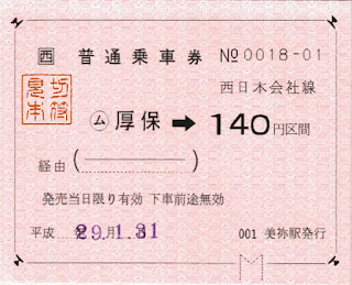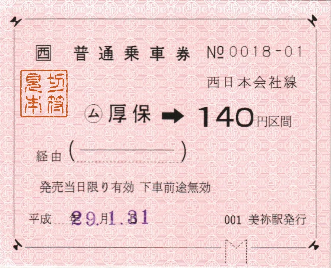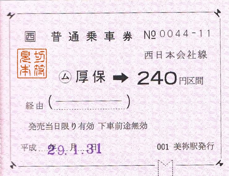 JR西日本~厚保駅常備券(1) JR西日本 X Facebook はてブ LINE コピー 2017.11.18 厚狭駅からは美祢線で厚保駅へ。 厚保駅の向かいの電気店で常備券を購入できます。 発行駅は美祢駅となっています。 240円区間の券は表紙付きで発売して頂きました。スキャンの都合上画像の色合いが少し異なります。