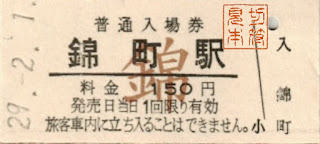 錦川鉄道~錦町駅硬券・券売機券 券売機券 X Facebook はてブ LINE コピー 2017.11.28 錦川鉄道で錦町駅に到着した私は、窓口で硬券を購入しました。 入場券です。「錦」の文字が印象的です。 岩国駅までの連絡硬券です。実使用しました。 券売機券です。食券タイプの券売機のボタンを押したら、文字通り食券のような地紋の券が出てきました。感熱印刷が地紋に負けそうです・・・