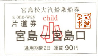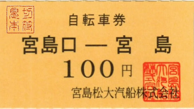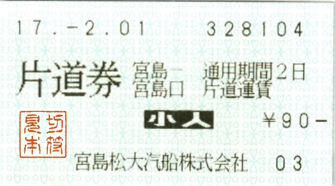 宮島松大汽船~宮島桟橋乗船券 券売機券 X Facebook はてブ LINE コピー 2017.12.06 宮島松大汽船で対岸の宮島に渡った私。 宮島桟橋でも乗船券を購入しました。 片道券です。宮島口と同様の様式ですが日付印はありません。 往復券は扱っていませんでした。 自転車券です。 券売機券です。
