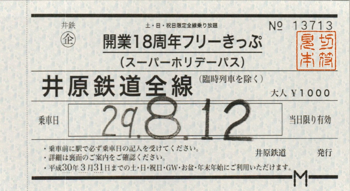 井原鉄道~開業18周年フリーきっぷ 井原鉄道 X Facebook はてブ LINE コピー 2018.01.13 2017年8月に井原鉄道に乗車してきました。 まずは神辺駅で井原鉄道乗車のためのフリーパスを購入しました。 開業18年を記念した切符だそうですが、どことなく国鉄時代の18きっぷを踏襲している印象を受けます。