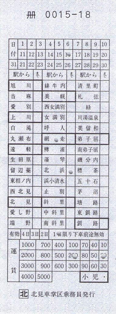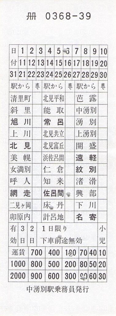 石北本線内で発行された切符と思われます。石北本線の他、釧網本線の駅名も並びます