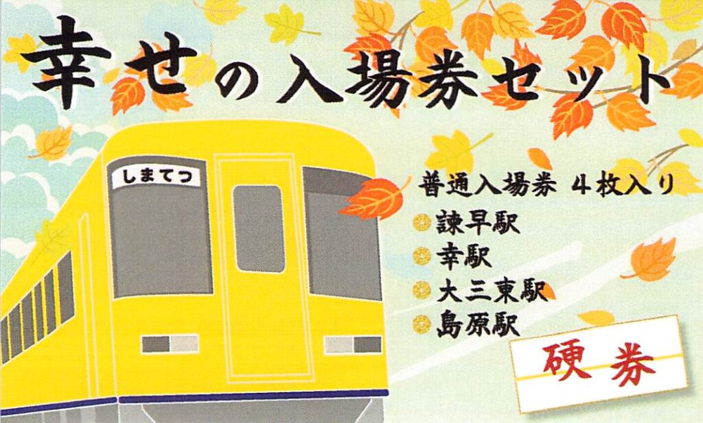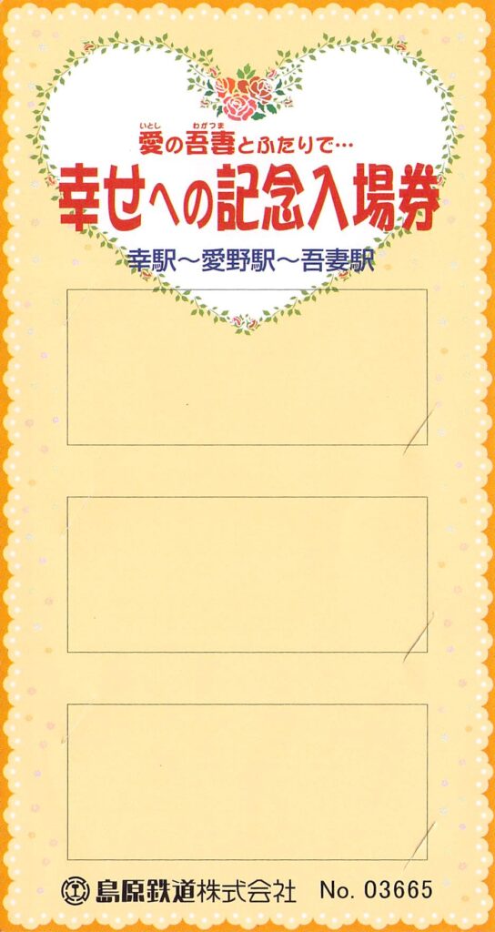 幸せの入場券セットです。島原鉄道ではスタンプで駅名を補充するタイプの硬券が使用されているようです。