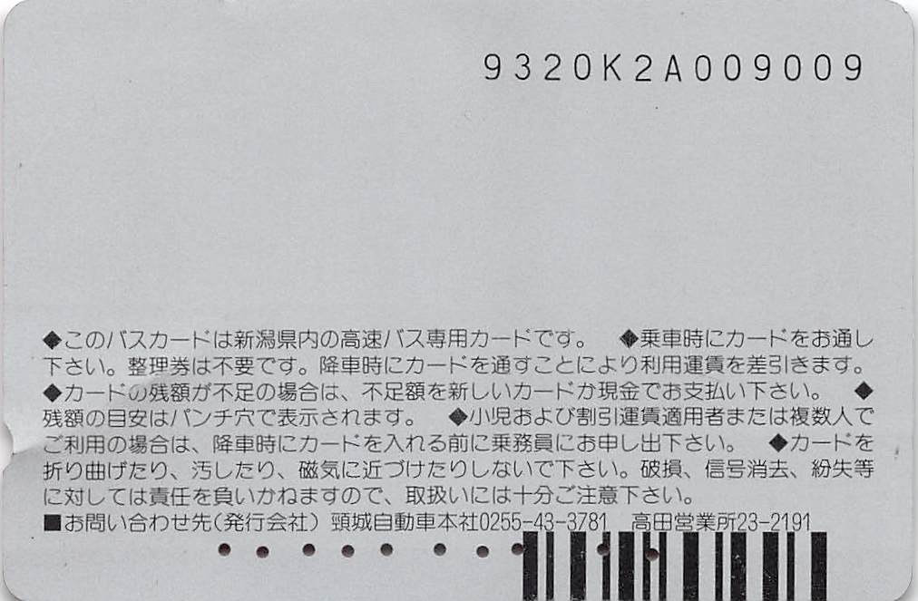 新潟交通・越後交通・頸城自動車共通のカードです。高速バス対応のカードで、なかなかの高額利用が可能なカードになります