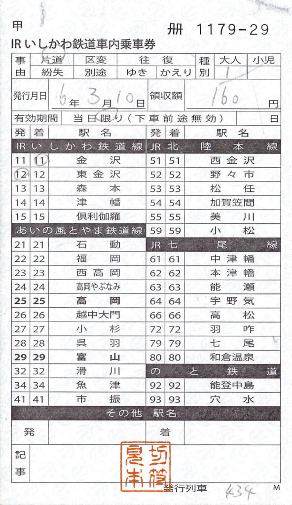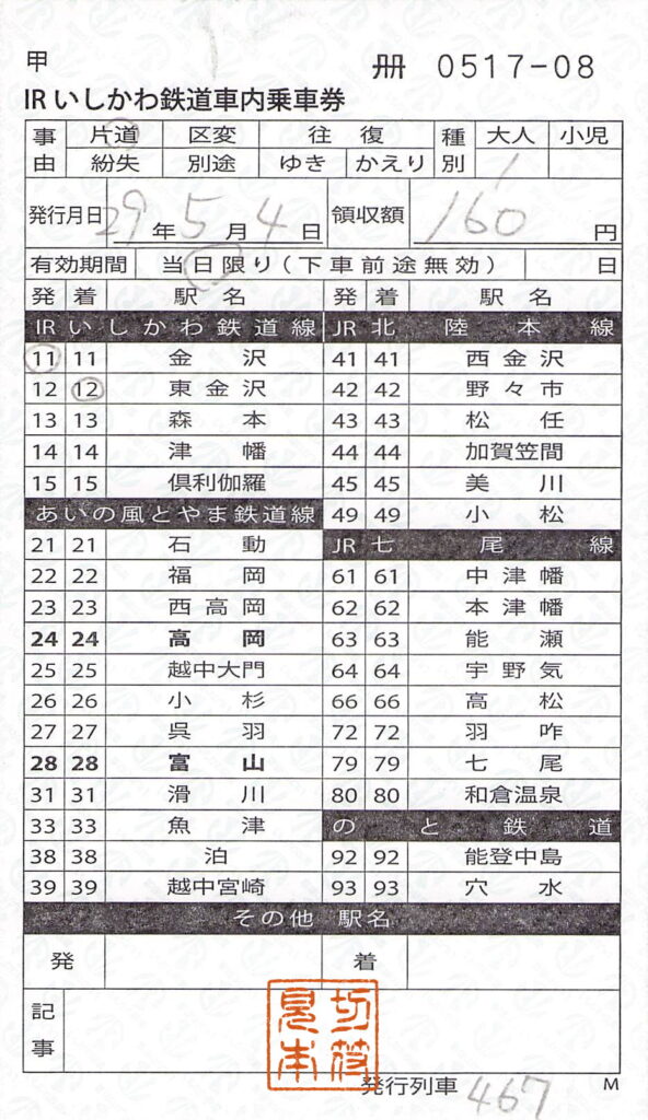 今回はIRいしかわ鉄道の車内乗車券を紹介します。JR北陸本線時代には、レシートタイプの携行型発券機からの発行でしたが、IRいしかわ鉄道になってからはコストカットのためか駅名式の乗車券が登場しました