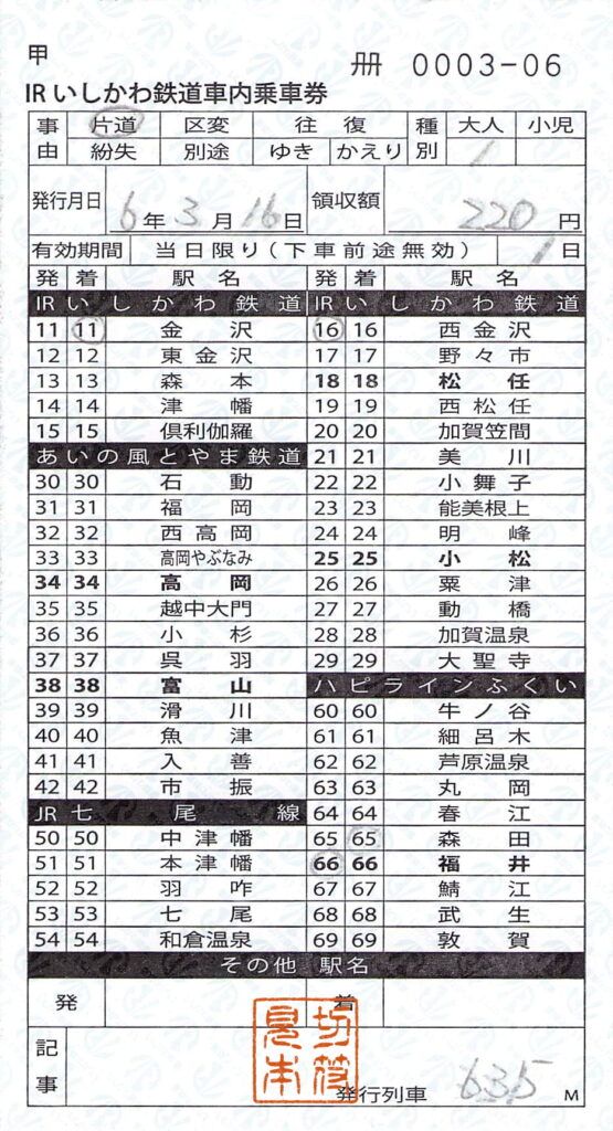 令和6年3月の、大聖寺延伸前の券です。あいの風とやま鉄道線の欄に印字されている駅名が変更になっています