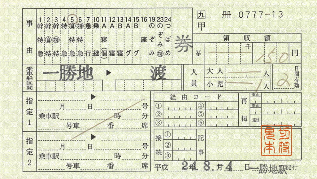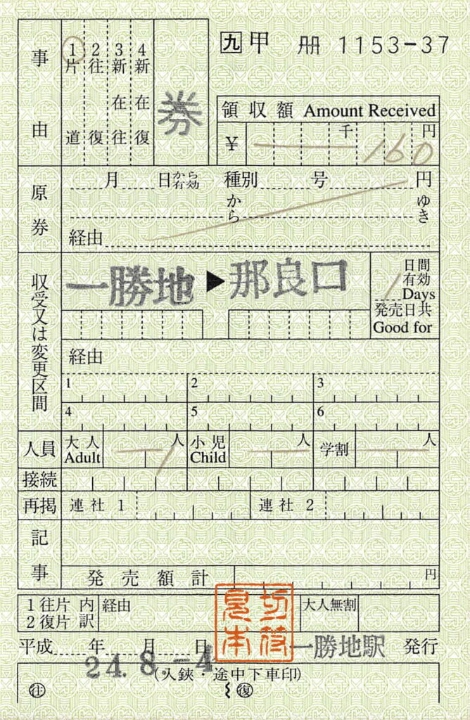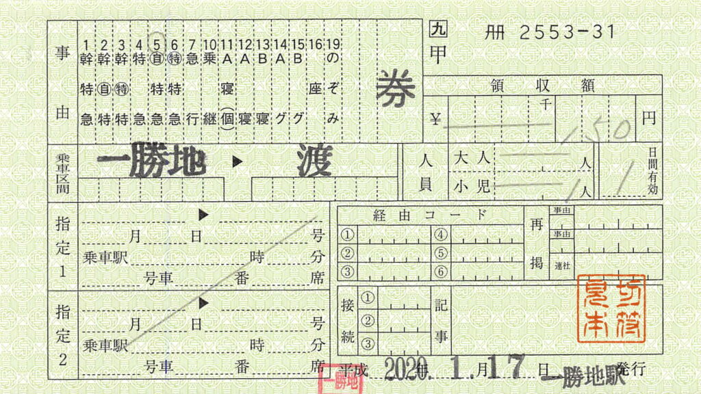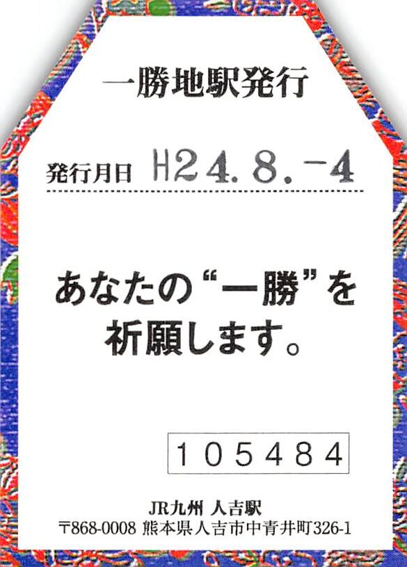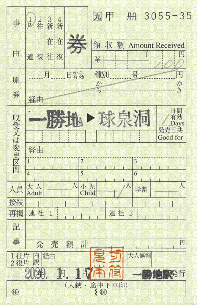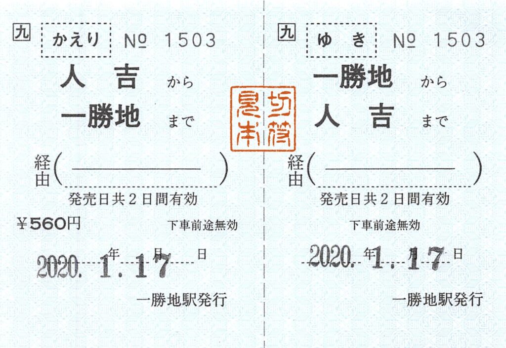 一勝地駅の乗車券類です。肥薩線は2020年7月の豪雨以来不通となっており、Wikipediaによると、一勝地駅では、現在は代行輸送のある人吉駅までの常備券(片道・往復)のみを発売しているようです。