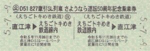 えちごトキめき鉄道-D51827 牽引 SL 列車 さようなら運転 50 周年記念乗車券・直江津 D51 レー ルパーク入場券-
