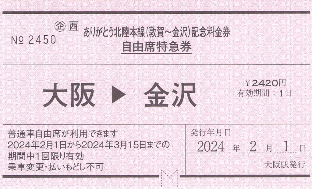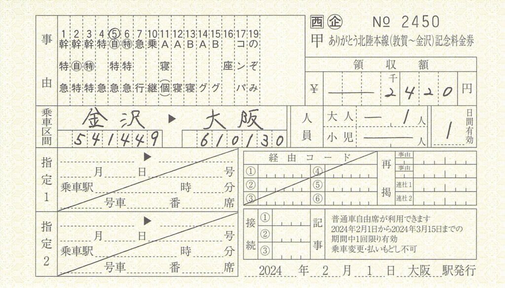 大阪・金沢間の自由席特急券の料金券なのですが、それぞれ常備券、料金専用補充券タイプになっています。補充券タイプも明らかに印刷なので補充券を模した常備券、といったところでしょうか。それでも面白い切符だと思います